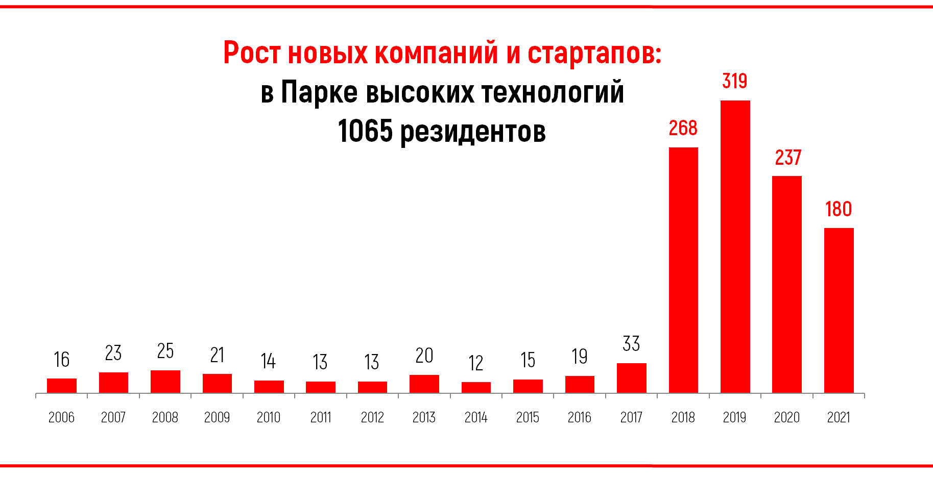 Продолжает расти и количество новых компаний в ПВТ. Всего за пять лет с момента принятия цифрового Декрета количество резидентов Парка выросло в 5 раз. Сегодня Парк объединяет более 1000 компаний.
