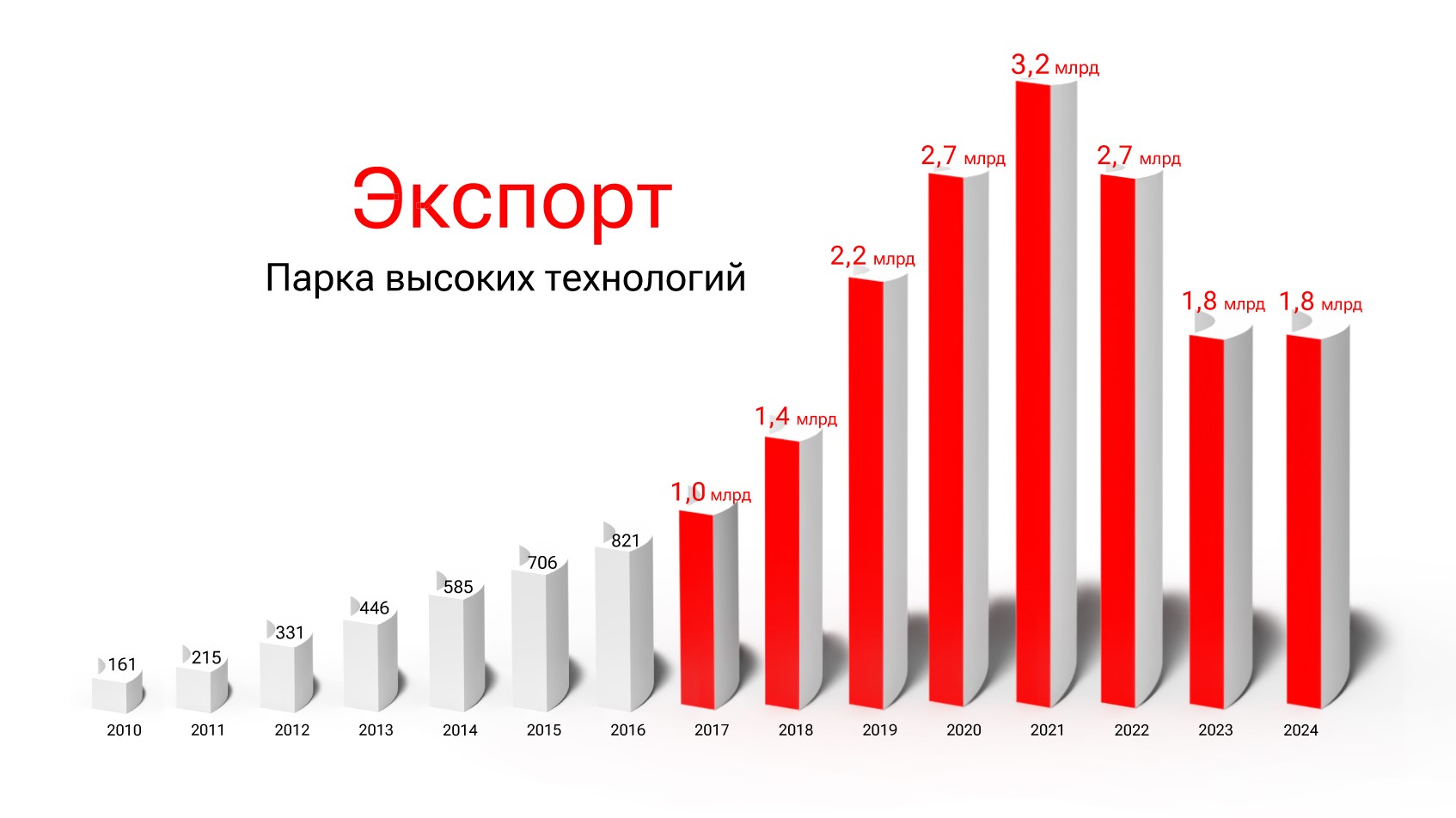 Сразу после принятия Декрета №8 в 2017 году рост экспорта составил 125% и впервые преодолел планку в $1,0 млрд. В период пандемии COVID-19 он продолжал уверенно расти. В 2021 году экспорт ПВТ достиг абсолютного рекорда и составил $3,2 млрд.
