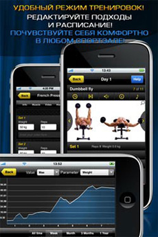 Программа содержит более 200 упражнений с фото, видео, аудио инструкциями, а также иллюстрациями на какие мышцы данное упражнение предназначено.